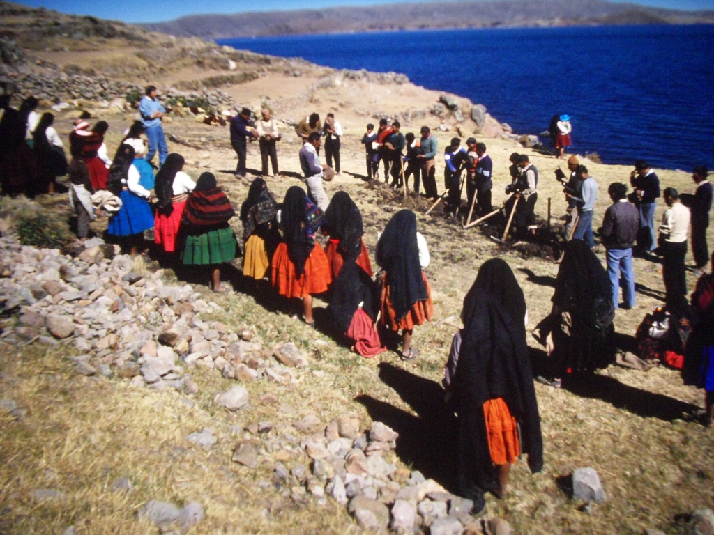 Notre première action fut d’informer les habitants de l’île d’Amantani à propos de contrats de travail qui leur étaient proposés. Vivant sur une île, leur problème principal était le manque de terres cultivables. Les hommes devaient donc partir pour essayer de trouver d’autres sources de revenus. Au moment où nous sommes arrivés, des « ingenieros » parcouraient les Andes pour tenter d’y embaucher des paysans pour un travail de recherche d’or dans des rivières d’Amazonie. Ils faisaient miroiter un bon salaire, alors que sur place, la réalité de ces travailleurs évidemment était tout autre. Leur contrat comprenait un aller simple par avion vers ces camps de travail en région tropicale. Là, ils vivaient dans des conditions d’extrême dénuement, auxquelles s’ajoutaient les maladies dues à un climat auquel ces montagnards n’étaient pas habitués. Affaiblis ou malades, ils s’endettaient avec les frais de médicaments, et ne pouvaient pas revenir chez eux. Nous avions donc commencé par décrire cette situation concrète dans les six villages de l’île, pour que les hommes puissent prendre leur décision en connaissance de cause. Ensuite, sur des bases légales, juridiques, nous avons participé à élaborer un projet d’appropriation de terres situées sur les côtes proches du Lac Titicaca, vers lesquelles ils pouvaient se rendre en bateau à partir de l’île.